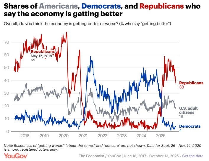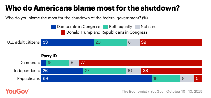Interesting to note that Dems and Indies are continuing to track in the same direction. Republicans are on an island by themselves. The MAGA 'No Kings are anti-America' tropes are a Hail Mary to deflect from their culpability for the shutdown, and provide cover for Holy Mike's refusal to seat Rep Adelita Grijalva so she can't vote to release the Epstein files.