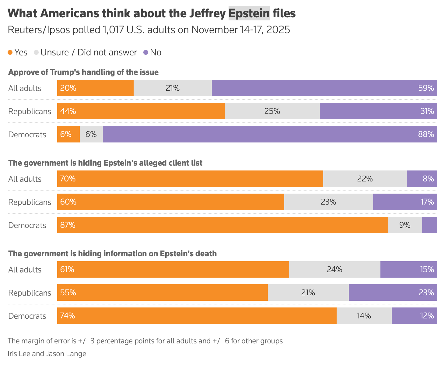 A vast majority—70%!—say the government is hiding the client list, and two-thirds say the government is hiding information about Epstein’s death.