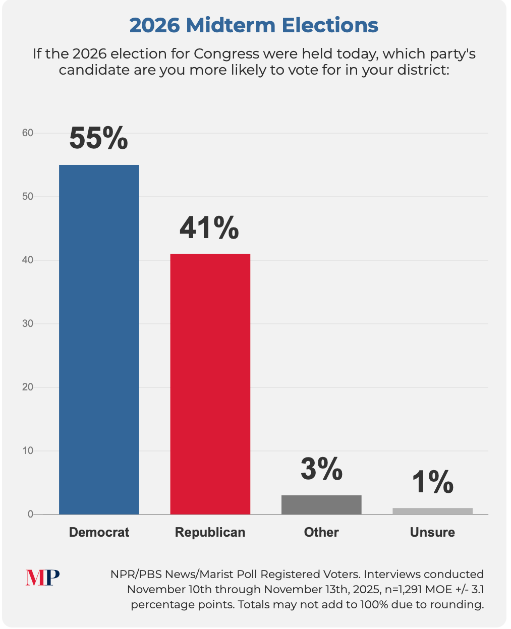 NPR/PBS/Marist findings released Wednesday show Democrats up 55–41. Among independents, Democrats lead by an astounding 33 points. A 14-point advantage overall would overcome any redistricting hijinks and put solid red congressional districts within reach for Democratic hopefuls.