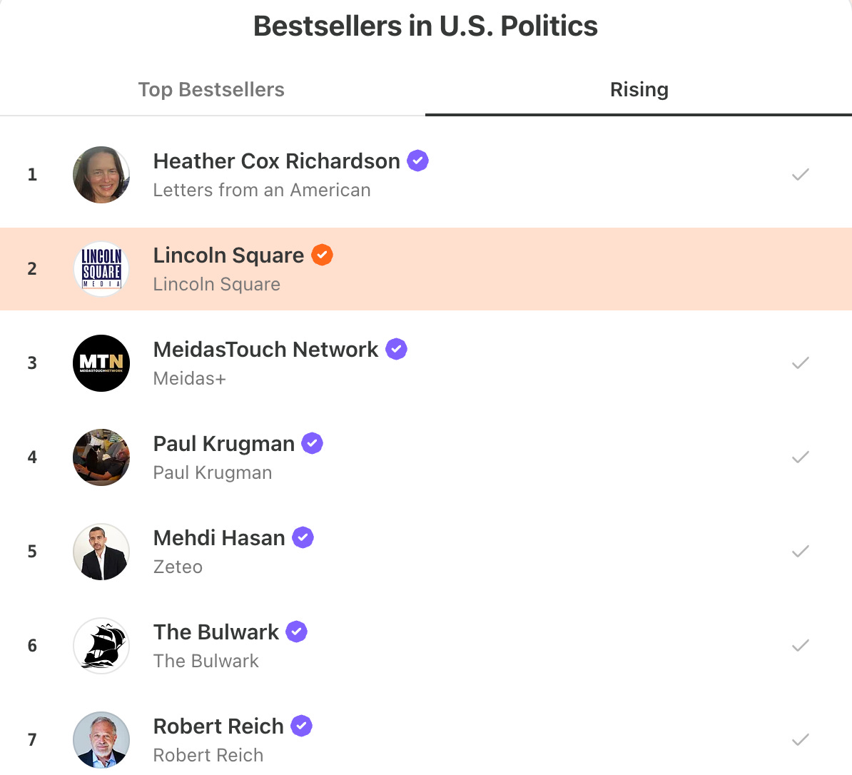 Oh, and fourth: Subscribe to Lincoln Square and share us with your network. We’re among the fastest-growing outlets on Substack, and it’s because of readers like you.