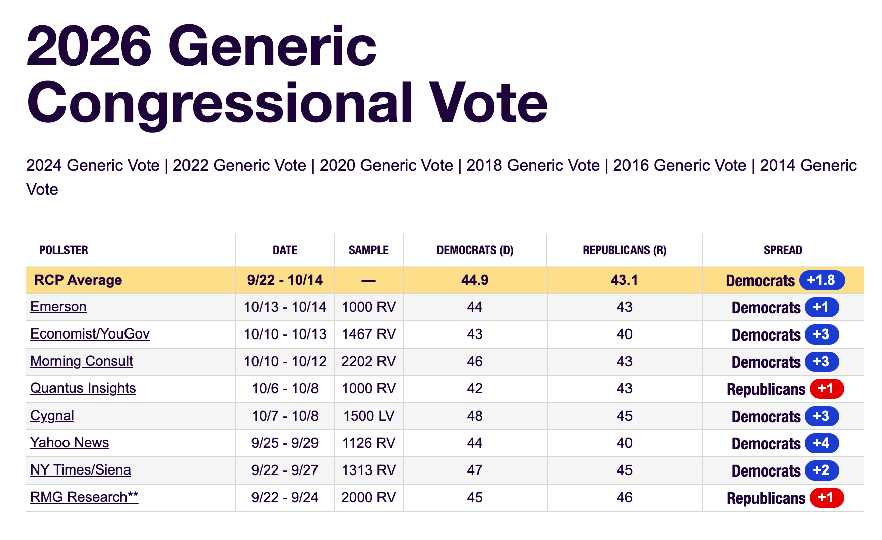 But where the rubber really hits the road is in the generic Congressional ballot (see below). Obviously, there’s a million years until November 2026 (or so it would feel like), but Dems, despite all their weaknesses, are still polling ahead of Republicans. Just imagine what would happen if Dems showed some spine!