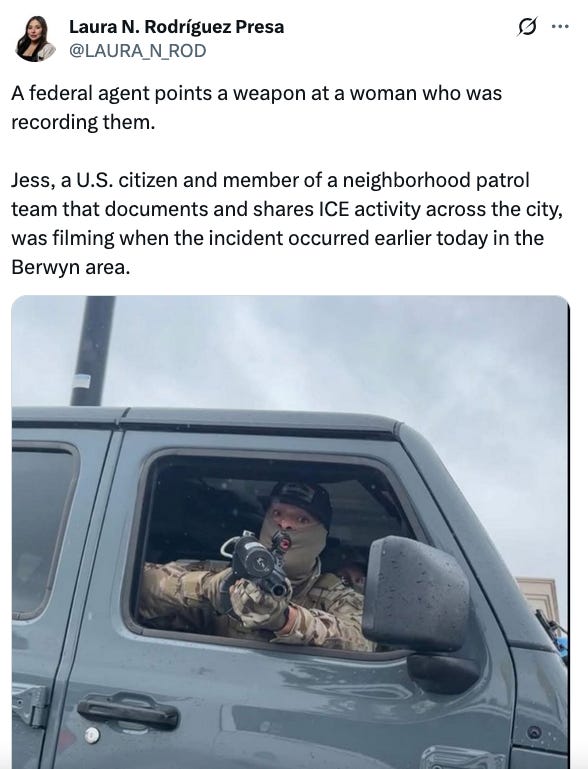 That’s exactly what happened in suburban Berwyn this week when this disturbing incident was captured on film. It shows a masked agent aiming a weapon directly at a woman who is filming ICE activity. This photo was shared by Chicago Tribune reporter Lauren Rodriquez Presa who later added a 2nd photo showing another angle of the same incident and updated the details about who took the original photo.
