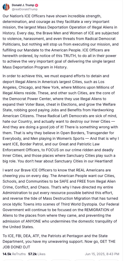 After the massive crowds at the thousands of “No Kings” protests on Saturday dwarfed the military parade Trump threw himself in Washington, D.C., he’s calling for expanded deportation operations in Democratic-led cities. That includes Los Angeles, where he’s already sent the National Guard and Marines to quell anti-ICE demonstrations.
