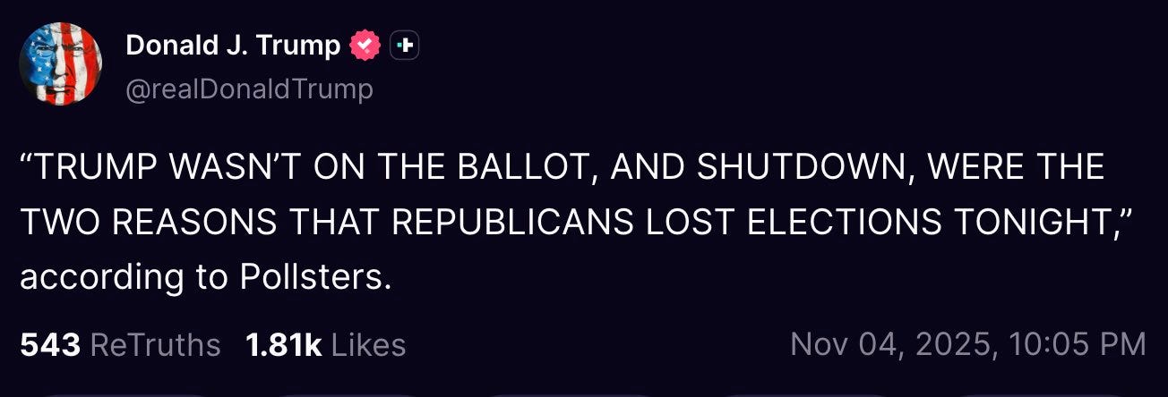 If you’re inside MAGA world, you’re doing the usual post-defeat interpretive dance “It wasn’t really a loss,” “Turnout,” “The media,” “If Trump were on the ballot …” but the rest of us saw what happened as plain as daylight: in two states where Republicans thought they had a shot, voters took one look at the chaos, the cruelty, the endless grievance playlist of Trump-era MAGA … and they chose normal.
