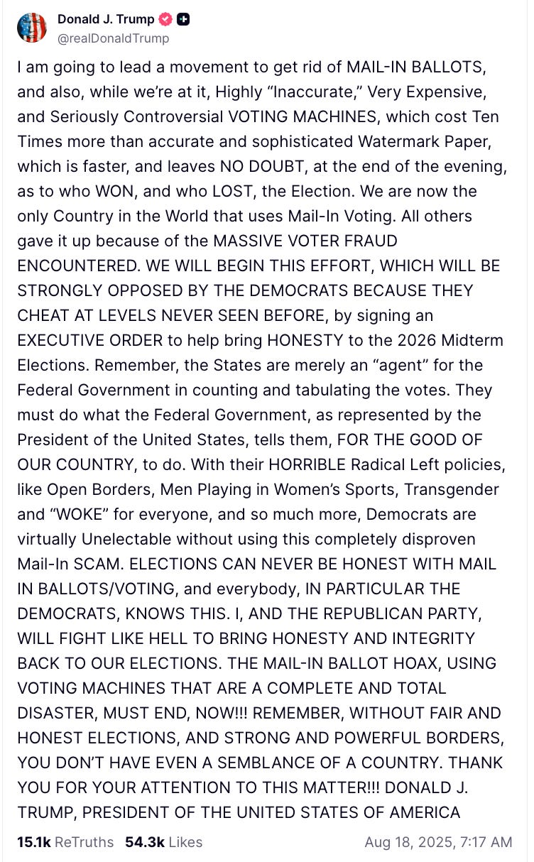 But Trump wasn’t done. This morning, he posted that he was going to get rid of “MAIL-IN BALLOTS” and “Seriously Controversial “VOTING MACHINES.”