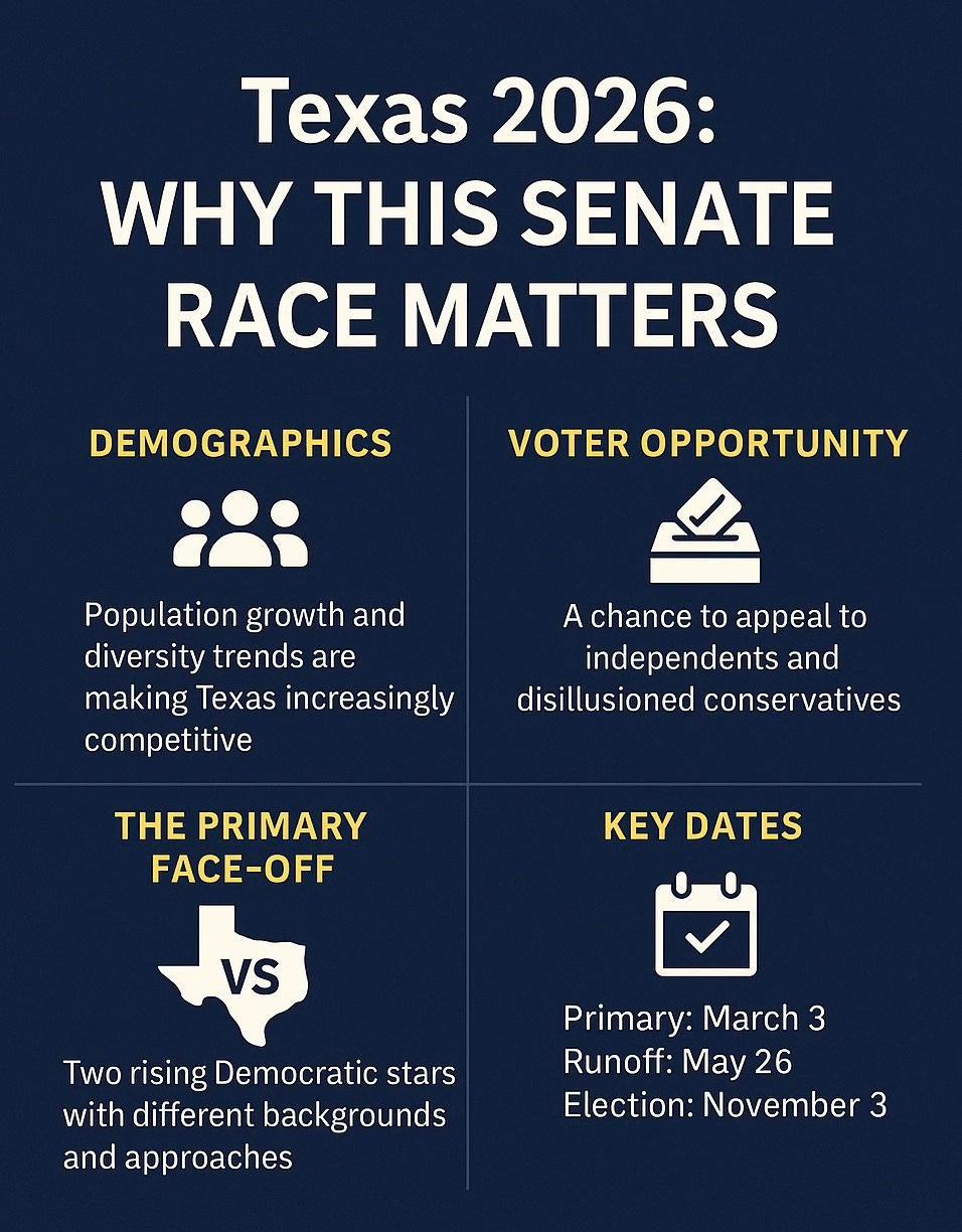 This is where the story begins, not in November. Because whichever Democratic candidate emerges will define whether this becomes a competitive fight or another year where Texas slips through Democrats’ fingers. This race is a test of message, momentum, the youth, media presence, money, and a movement.