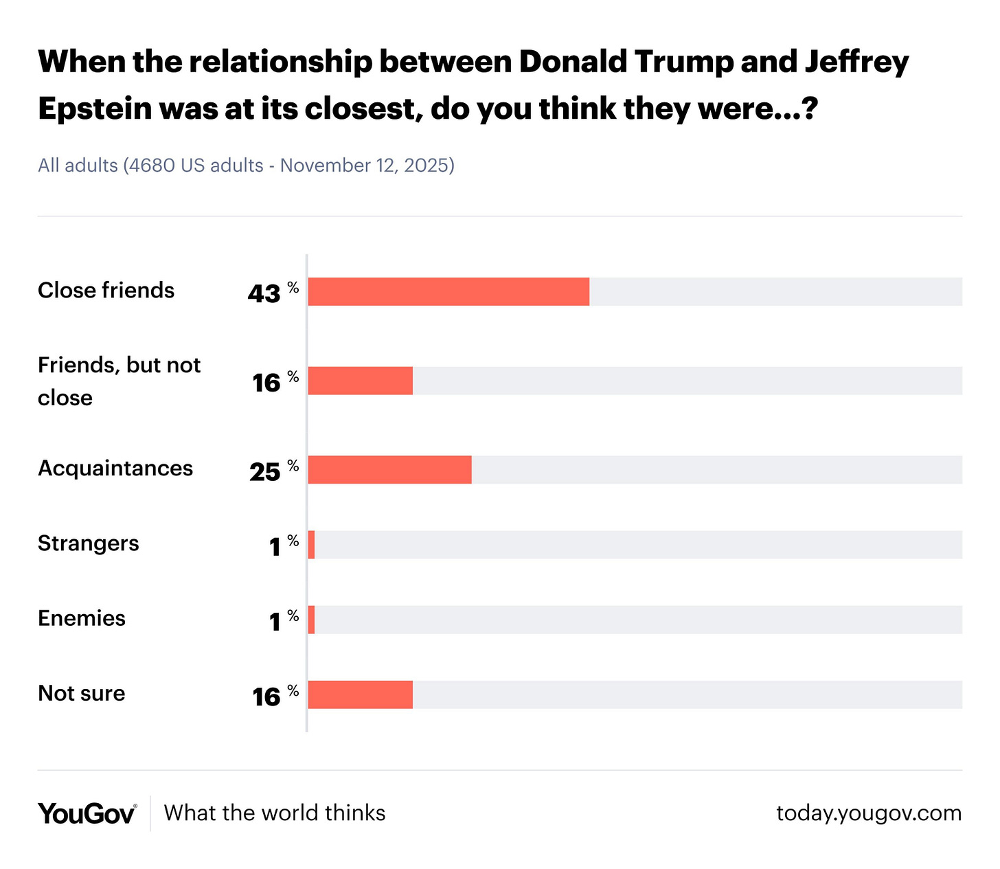 Then there’s the character blow: YouGov finds 43% of Americans now describe Trump and Epstein as “close friends,” a framing that pushes the story from scandal to moral corrosion.