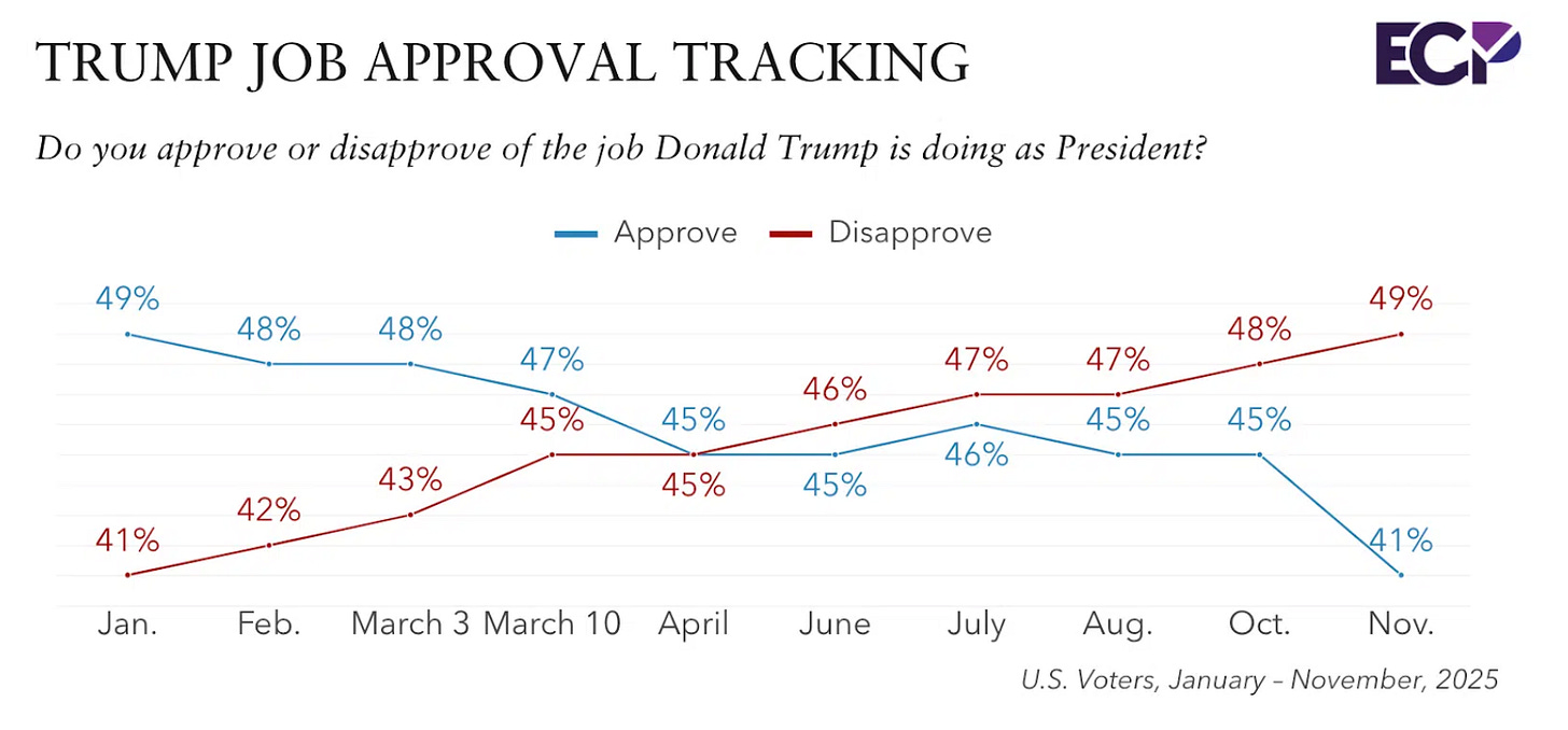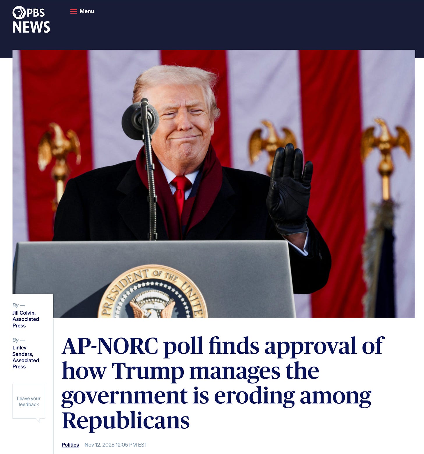 Trump’s approval is in freefall, with the ECP tracker dropping him to 41% approval while AP-NORC shows Republican support collapsing from 81% in March to 68% in November (insert image: AP-NORC GOP erosion graphic).