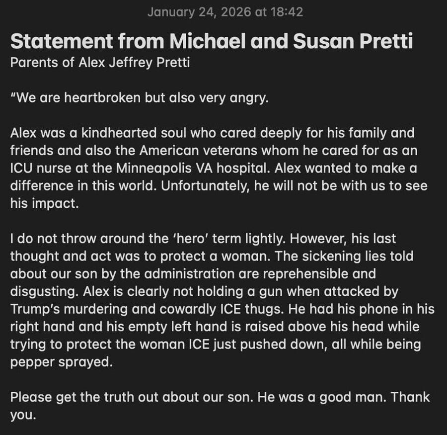 His parents, Michael and Susan Pretti, issued a statement that they were “heartbroken but also very angry,” entreating the media to “please get the truth out about our son.”