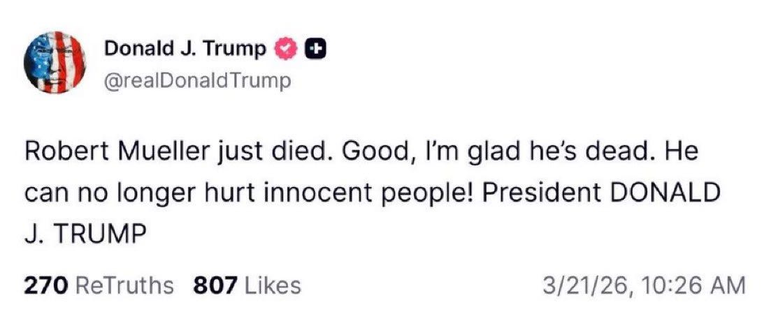 On March 20, 2026, former FBI Director Robert Mueller died, and President Donald Trump responded as if the moment settled a score rather than closed a life. He offered no restraint. He celebrated.