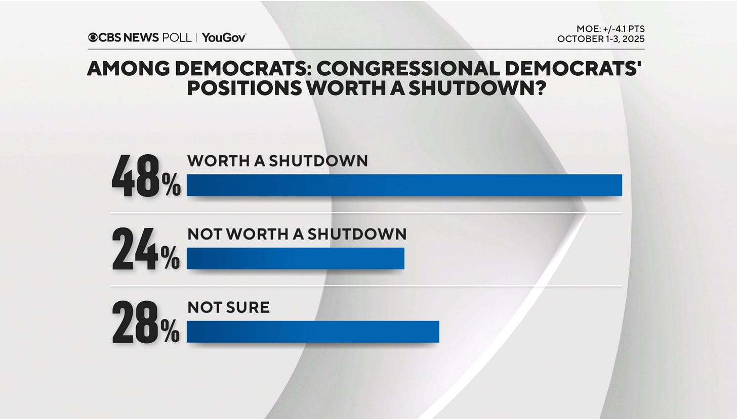 There’s also real energy on the Democratic side. Nearly half of Democrats say the shutdown is worth it, suggesting that voters believe Democratic leaders are taking a principled stand — not playing political games.