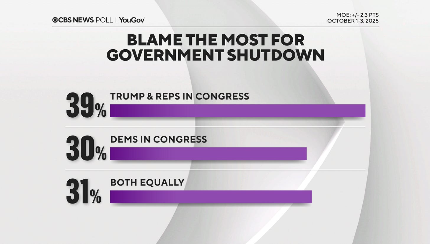 According to a CBS News/YouGov poll conducted October 1–3, nearly 2 in 5 Americans blame Trump and the GOP for the shutdown. History tells us that whoever gets blamed early stays blamed — and this year looks no different.