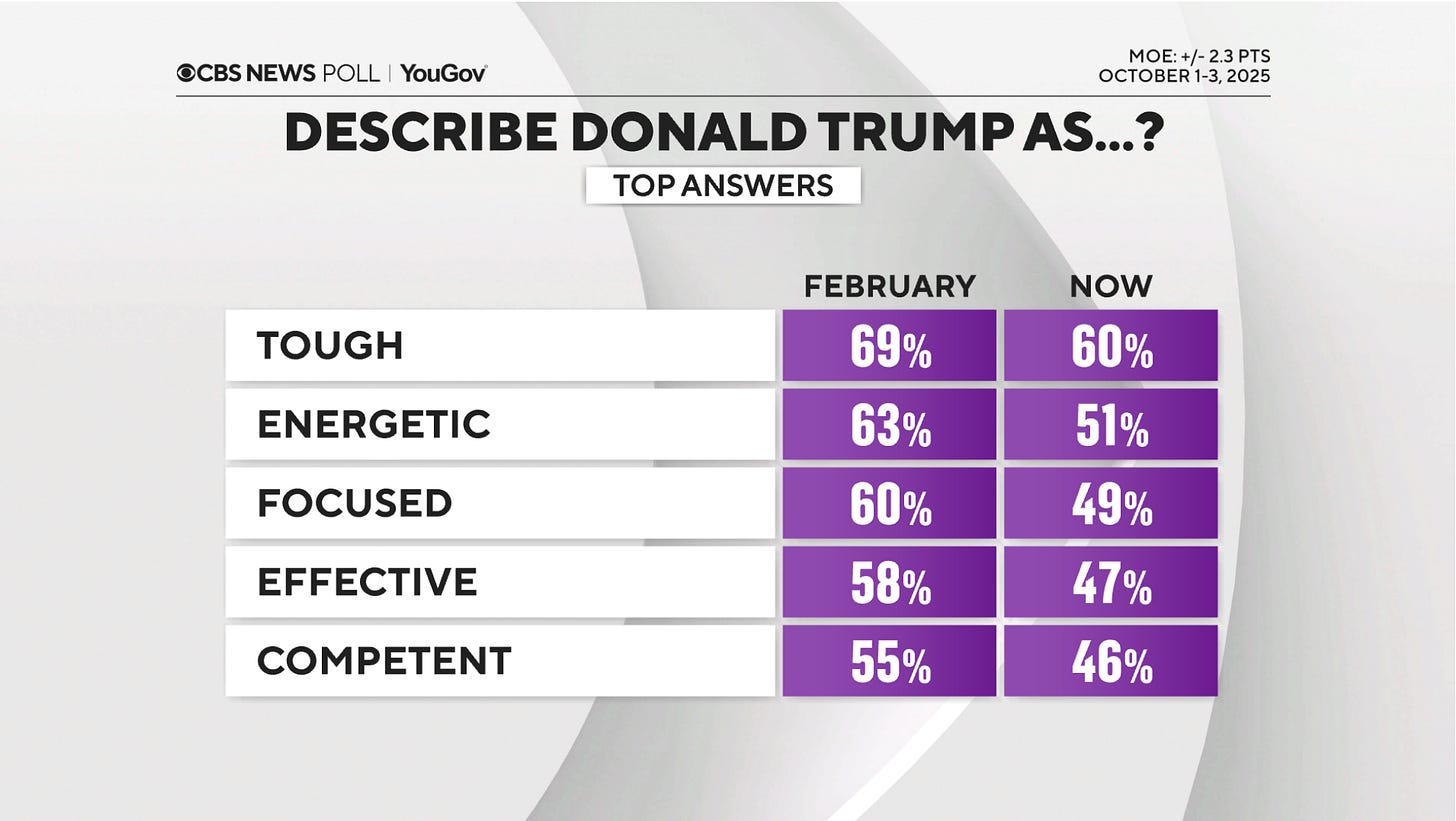 For years, Trump built his brand on “toughness.” But that image is cracking. Fewer Americans now see him as effective, focused, or even tough — the one trait he’s clung to through scandal and failure.