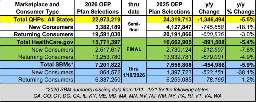 In any event, it’s time to take a look at the 2026 Open Enrollment Period (OEP) numbers. While it’s still happening in some states (see below), the final deadline passed on Jan. 15th in most states.