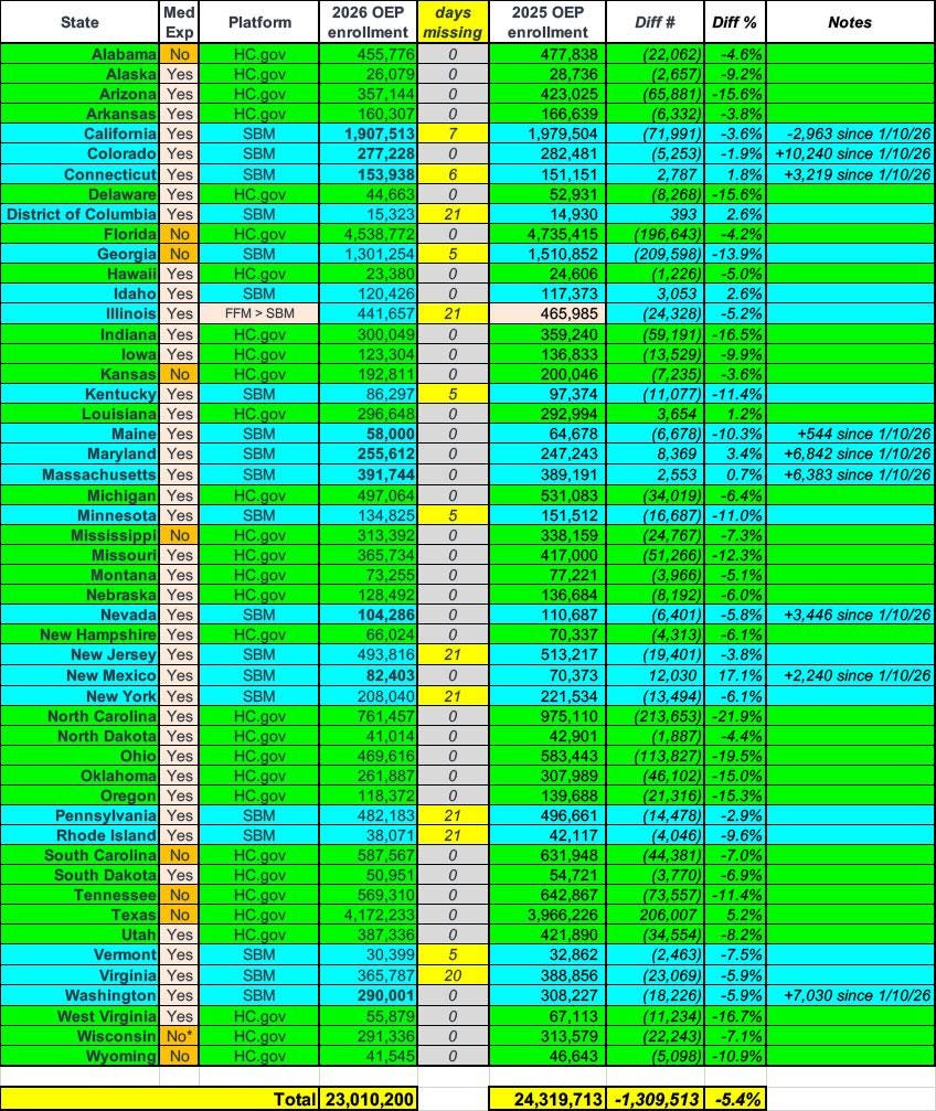The total of the state by state breakout below is around 37,000 higher than the 2026 summary total above due to my having more recent enrollment data for 9 of the SBM states (CA, CO, CT, ME, MD, MA, NV, NM & WA). I’ve included a column to note how many days of enrollment data are still missing for 13 of the SBM states:
