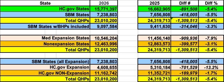 While this is officially “only” 1.3 million fewer (still a lot losing coverage!) than the final 2025 Open Enrollment tally, there’s some vitally important caveats to keep in mind, as I warned back in December: