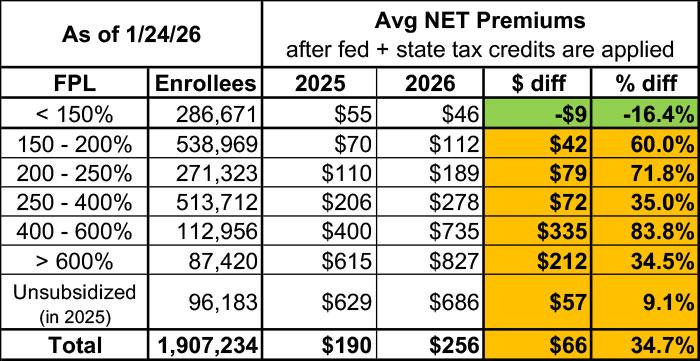 In addition, millions of those who have enrolled for 2026 coverage (my own family included) were forced to significantly downgrade their coverage to worse plans with dramatically higher deductibles & other out of pocket costs