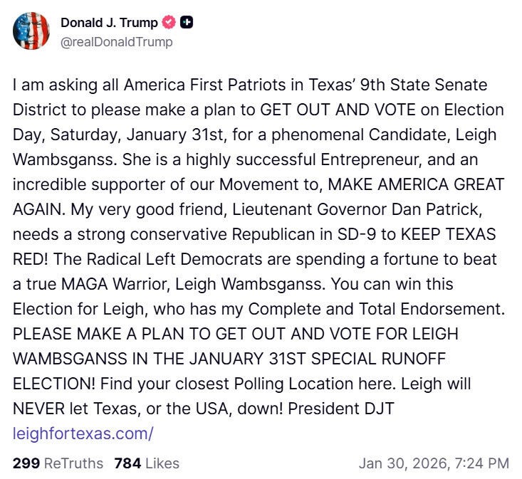 Everything’s bigger in Texas. And this weekend saw one of the biggest wins in the state for Democrats in years. Taylor Rehmet, a Democrat running for state Senate in the state’s 9th District, trounced his opponent in a district that was Trump won by 17 points in the 2024 election. Rehmet beat his opponent, Republican Leigh Wambsganss, 57%-43% in a runoff Saturday. But Trump quickly distanced himself from the results, claiming he didn’t know anything about it. Even though he totally did.