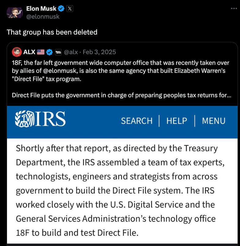 It seems more than a little ironic, then, that Direct File was filled by people who said they were bringing tech innovations to government. The fate of Direct File under DOGE was initially unclear. Musk talked about building a product that sounded a lot like Direct File, but he also pledged to get rid of the tech unit 18F when someone pointed out they were involved in Direct File.