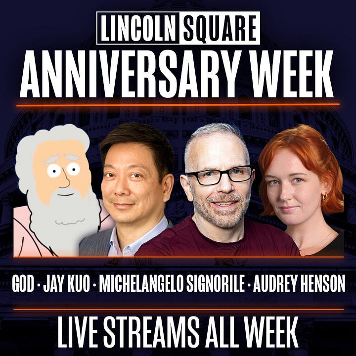 What’s a celebration without the “galactic manager” himself … Yes, that’s right, Sam Osterhout welcomed God, who writes Letters From God here on Substack, to Lincoln Square to ring in our one-year anniversary (Jesus was supposed to come, but it looks like he … Holy-Ghosted us).