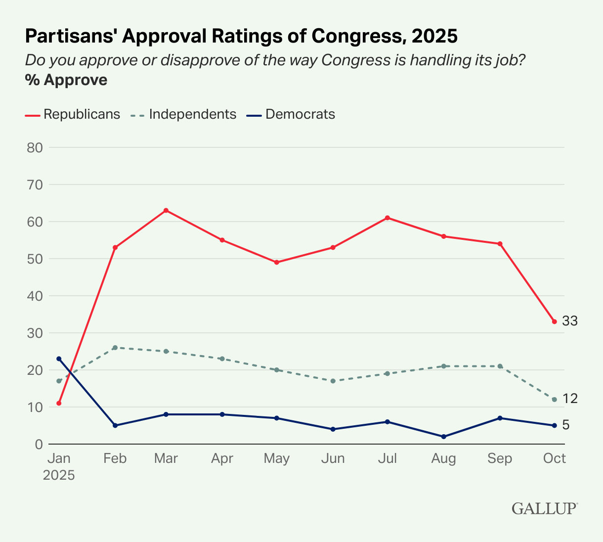 A separate Gallup survey puts overall congressional approval in the teens, marking a sharp drop among Republicans since the start of the shutdown. The chaos in Washington is wearing thin with everyone — including the GOP’s own base.