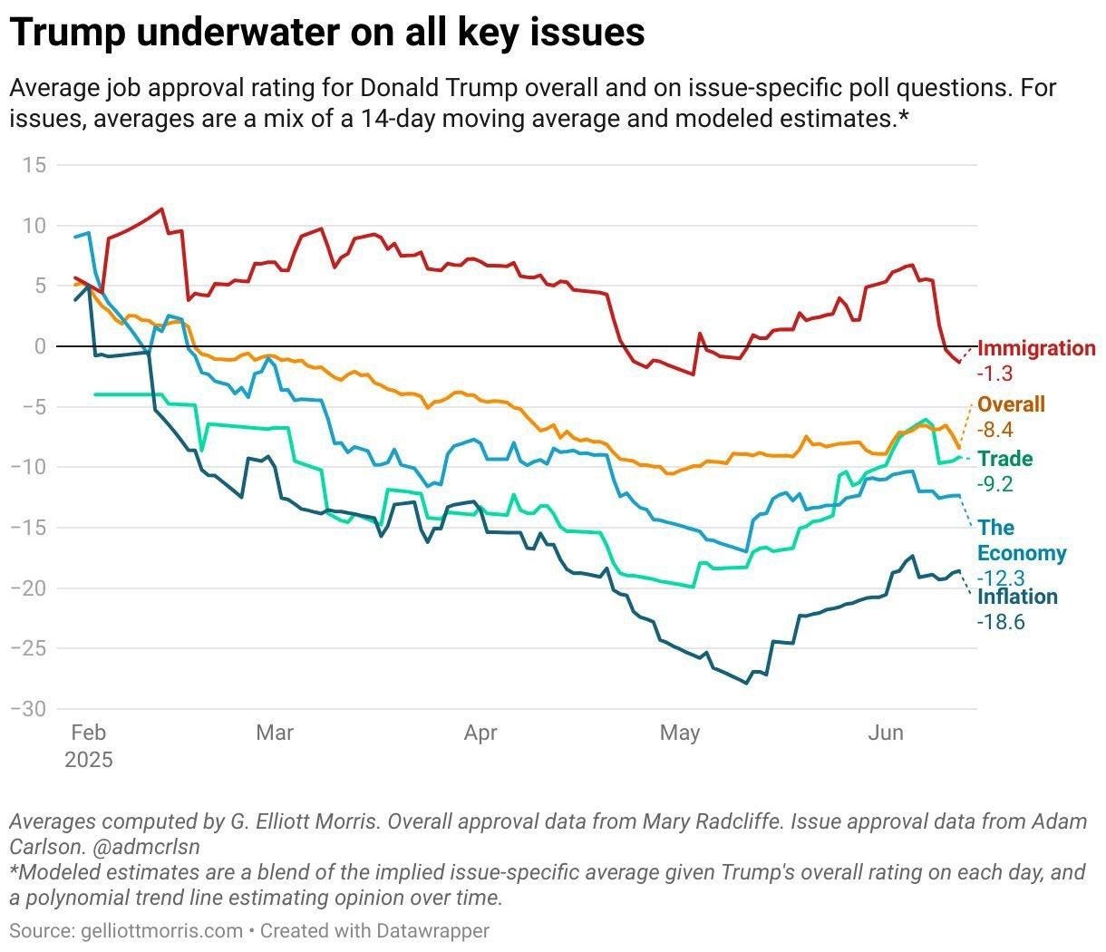 I could go on. But if you are horrified, you’re not alone — and the numbers prove it. Americans are patently disgusted by what’s going on in our streets. Not only that, they don’t love how Trump’s handling immigration in general. Or trade. Or the economy. Or inflation.
