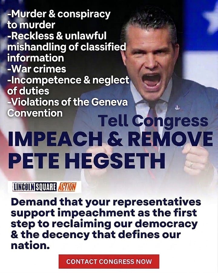 This week’s Weekly Assignment for us all is to tell your members of Congress to impeach “Secretary of War” Pete Hegseth.