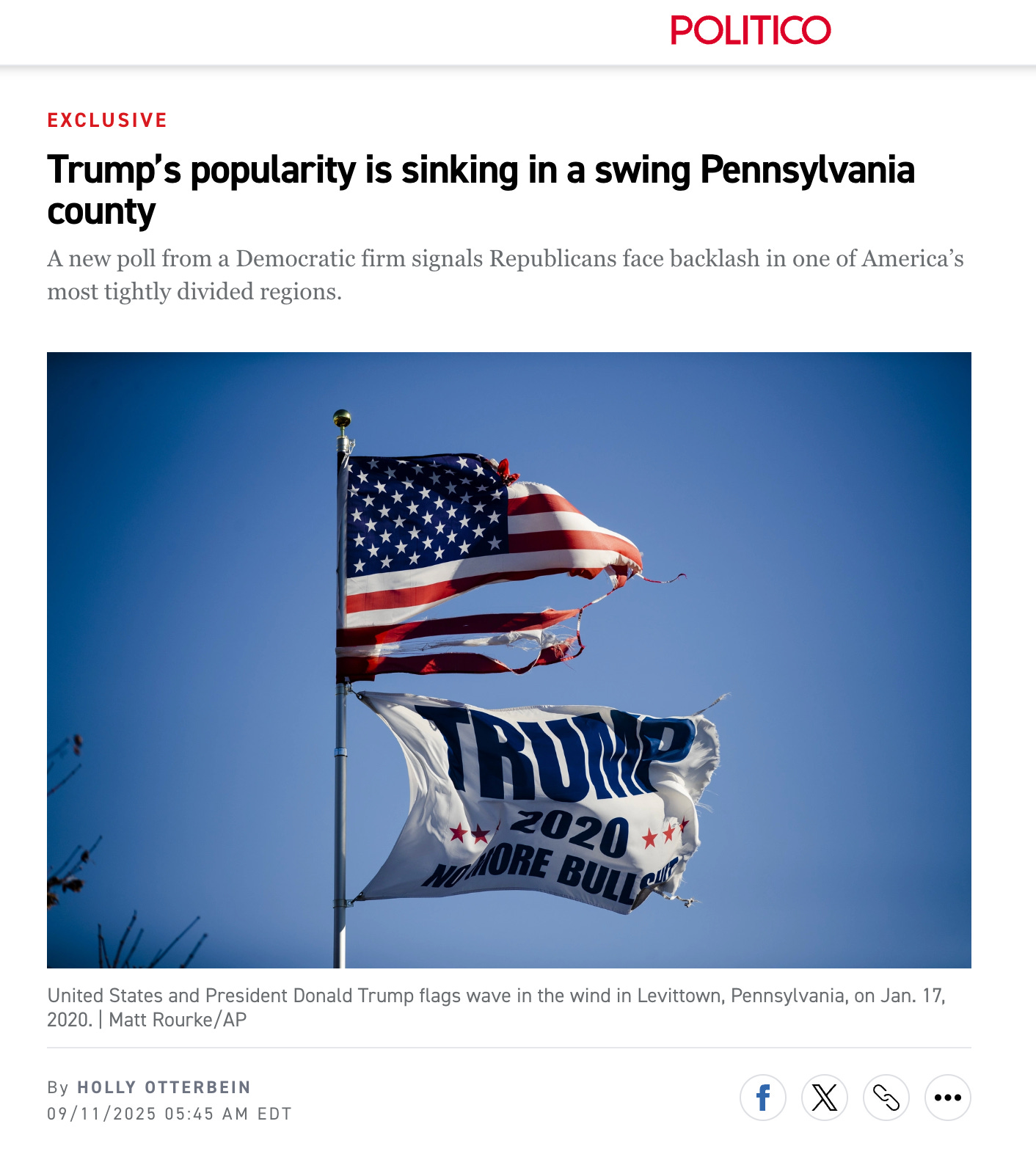 Nowhere is the damage clearer than Bucks County, Pennsylvania — the suburban bellwether Andrew calls “one of the swingiest parts of the country.” Trump is underwater there, with a 42% disapproval that spells trouble for Republican Rep. Brian Fitzpatrick’s reelection. As Rick recalls, voters once buy Trump’s “low tax, strong on crime” pitch because prices are stable. Now, with inflation biting and immigration policies cutting into households’ daily lives, “the persuasion matrix… is not in the Republicans’ favor right now.” For Democrats, health care and Medicare cuts remain potent levers, but the larger truth looks simpler: Trump drags down his own side.