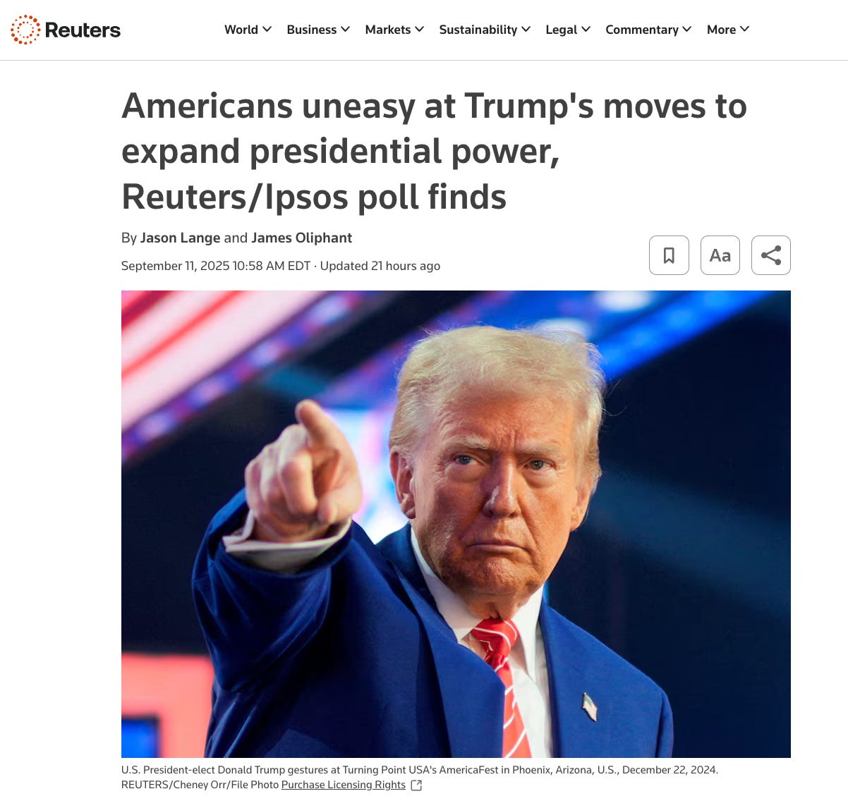 Authoritarian overreach deepens the fracture. The Reuters/Ipsos survey finds majorities uneasy with Trump’s push to expand presidential power, and Rick stresses that “the authoritarian overreach is now creeping into the actual polling.” Deploying the military onto the streets of D.C. doesn’t read as a show of strength; it lands as weakness, desperation, and a government spinning out. That same erosion of confidence shows up in another place presidents can’t afford to lose it: their personal credibility.