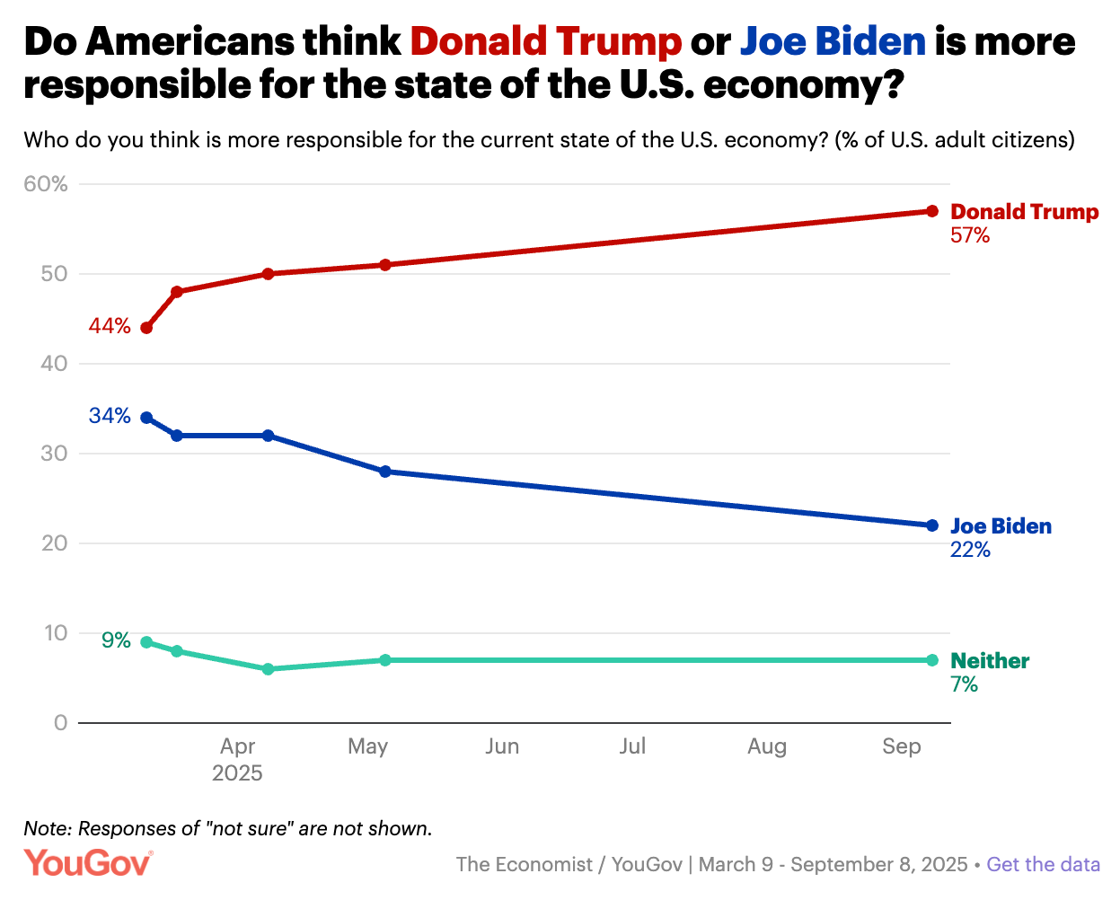 Trump’s economic brand cracks wide open. Andrew Wilson points out that Trump’s approval on the economy sinks to 36%, that’s “worse than Biden’s were in his worst moments.” That collapse isn’t just about vibes — voters now say Trump’s policies themselves make the economy worse. The businessman persona he builds his politics on curdles into liability, as tariffs, attacks on the Fed, and wild swings in policy become impossible to spin away when people stare at higher bills in grocery aisles and at the pump. As Rick Wilson puts it, “He’s not just a symptom; he’s the cause.”