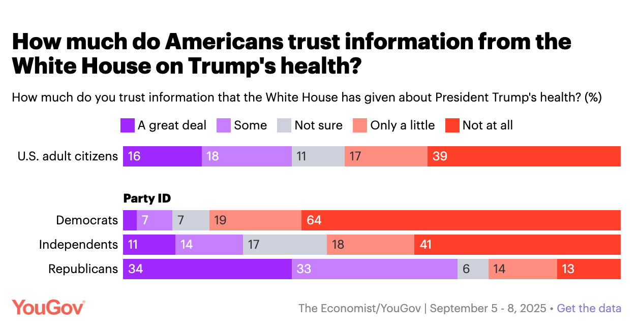 Fewer than half of Americans trust what the White House says about Trump’s own health, with Democrats overwhelmingly disbelieving, independents split, and only Republicans offering real support. Andrew notes that once a president loses trust on something as basic as whether he is physically fit to lead, “people start questioning everything else they say.” When voters already doubt the numbers on the economy, the collapse of confidence in Trump’s health messaging adds another layer to the sense of a presidency adrift.