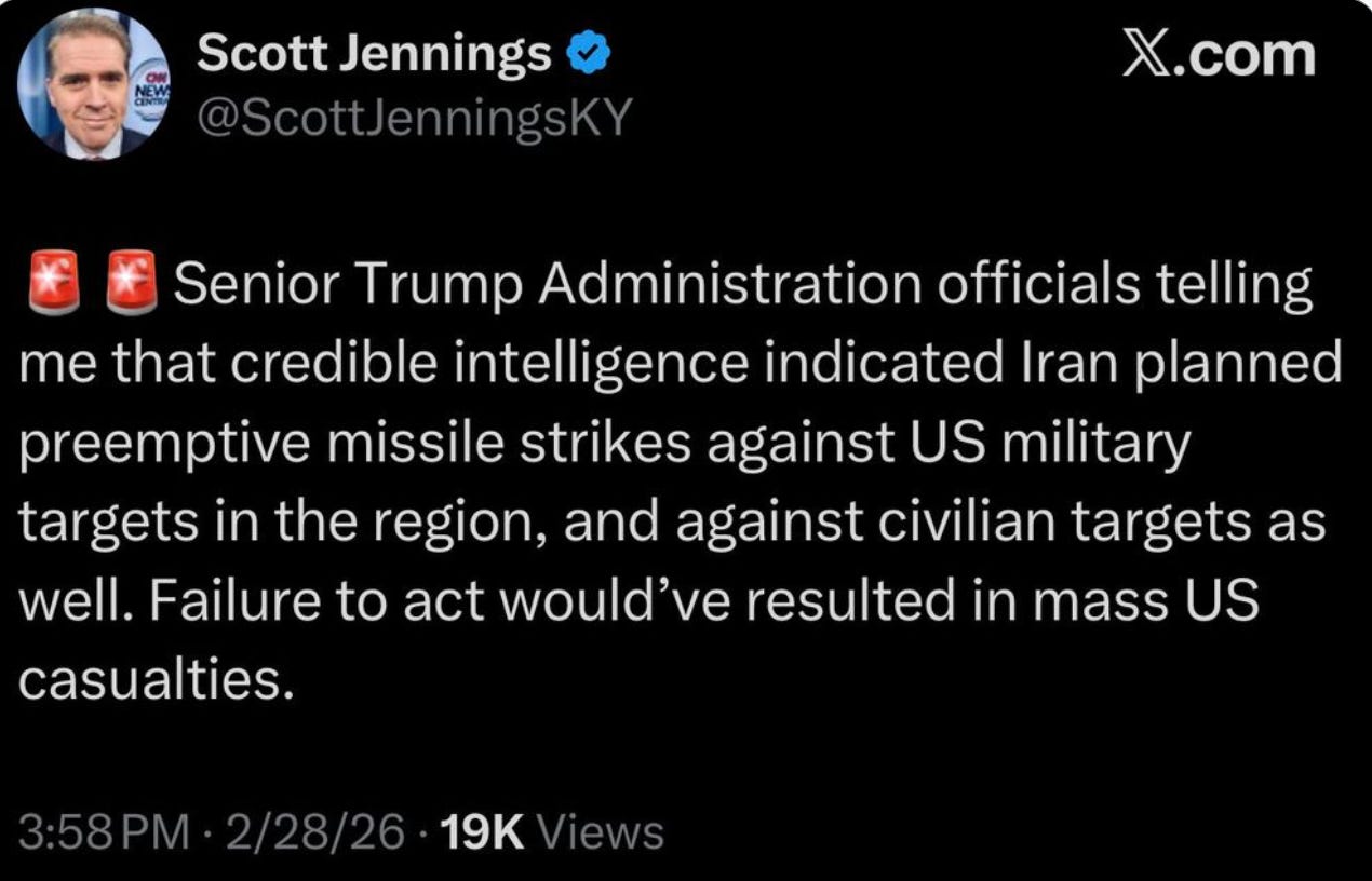 According to Trump mouthpiece and CNN commentator Scott Jennings, Iran was actually just about to attack the U.S. We stopped them in the nick of time. While the U.S. had warships at its door, Iran had planned a preemptive strike. I wonder if the officials Jennings refers to were the same administration officials that were saying that credible intelligence said that Iran would have nuclear weapons next week, or that it would be soon firing missiles at the United States.