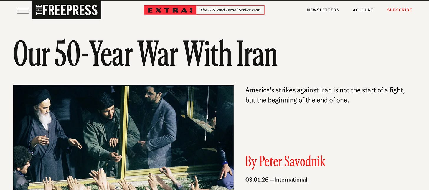 It this sounds sort of nuts, be assured that for some Americans, the Iranian revolution, including its kidnapping of American hostages, felt like a declaration of war. For example, The Free Press, the best indicator of the editorial preferences of Bari Weiss, who runs CBS News, is resolutely supportive of the attack, presenting the it as “the end” of “our 50-year war with Iran.”