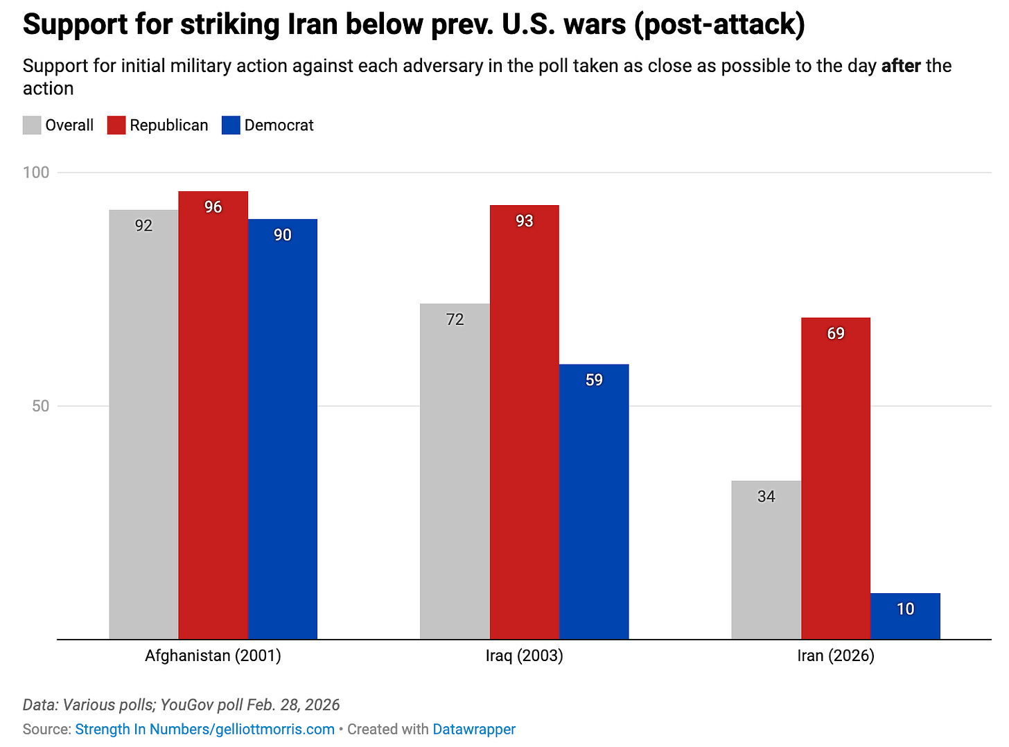 First, there is not public buy-in for the war. It is worth remembering that the pattern of Middle Eastern wars is that they start as popular, and then become calamitous as time goes on. This one starts as unpopular because there is no compelling justification to rally around the flag.