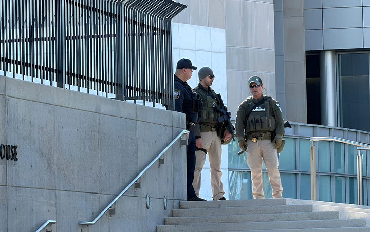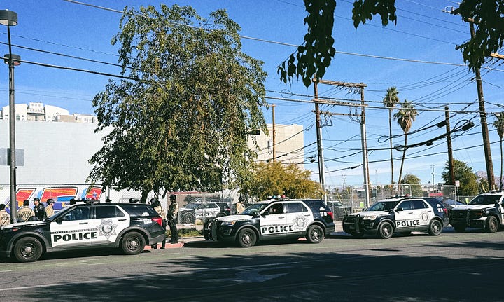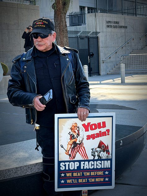 And at the peaceful rally of about 500 on Sunday in Las Vegas, I counted about 100 law enforcement officials mulling around, many in full riot gear — which seemed like a tad of an overreaction to an event marked by prayers and folk music.
