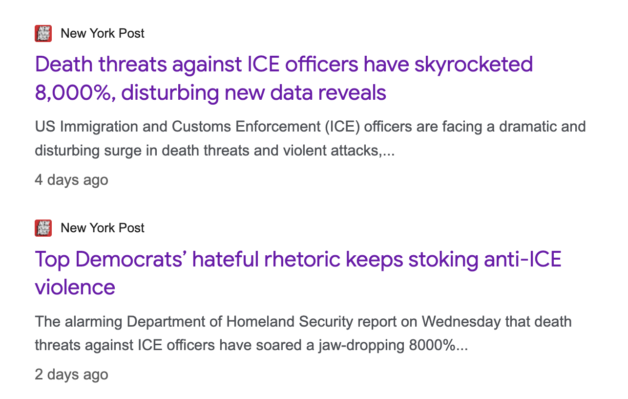 These claims are featured in headlines and coverage. For example, the New York Post reports the numbers uncritically, and then blames Democrats for the surge in anti-DHS threats.