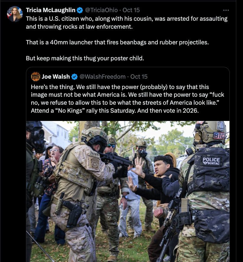 Dayanne Figueroa is a US citizen who was driving in Chicago near a site where federal agents were arresting landscapers. According to DHS she “crashed into an unmarked government vehicle and violently resisted arrest, injuring two officers.” The Assistant Secretary of DHS Tricia McLaughlin (remember that name) said Figueroa “used her vehicle to block in agents, honking her horn,” and that she “struck an unmarked government vehicle…In fear of public safety and of law enforcement, officers attempted to remove her from the vehicle. She violently resisted, kicking two agents and causing injuries. This agitator was arrested for assault on a federal agent.”