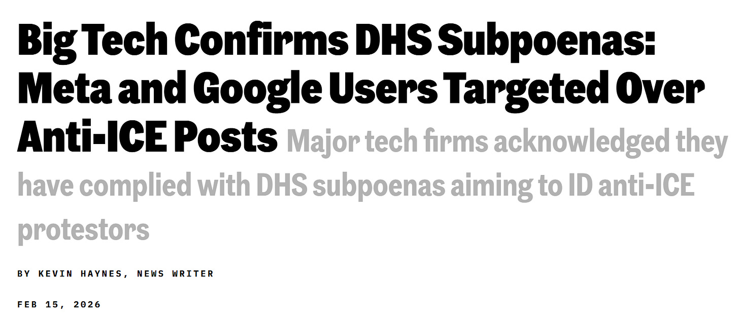 Recent reports from mid-February 2026 confirm a massive escalation in state surveillance. Under Secretary Kristi Noem, the DHS has bypassed the judicial system entirely, issuing hundreds of administrative subpoenas to Meta, Google, Reddit, and Discord.